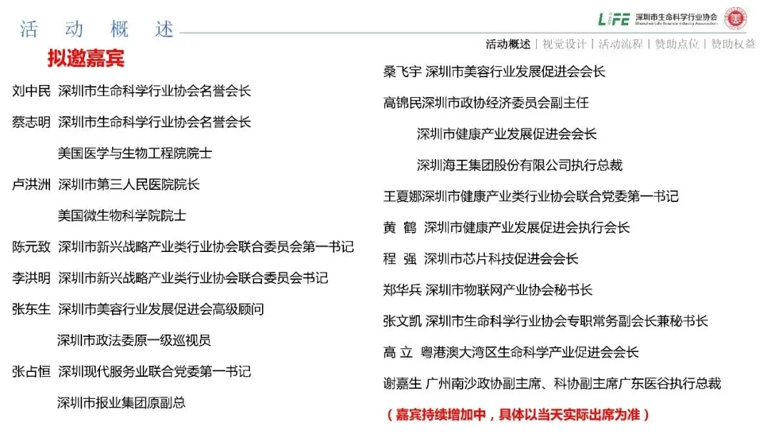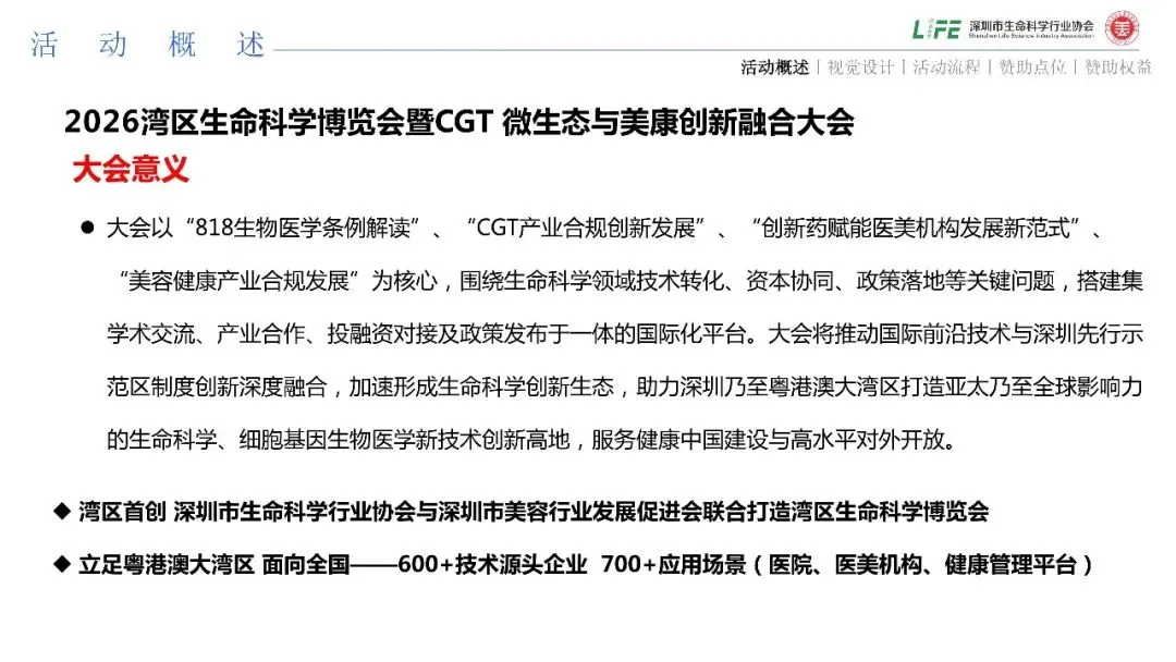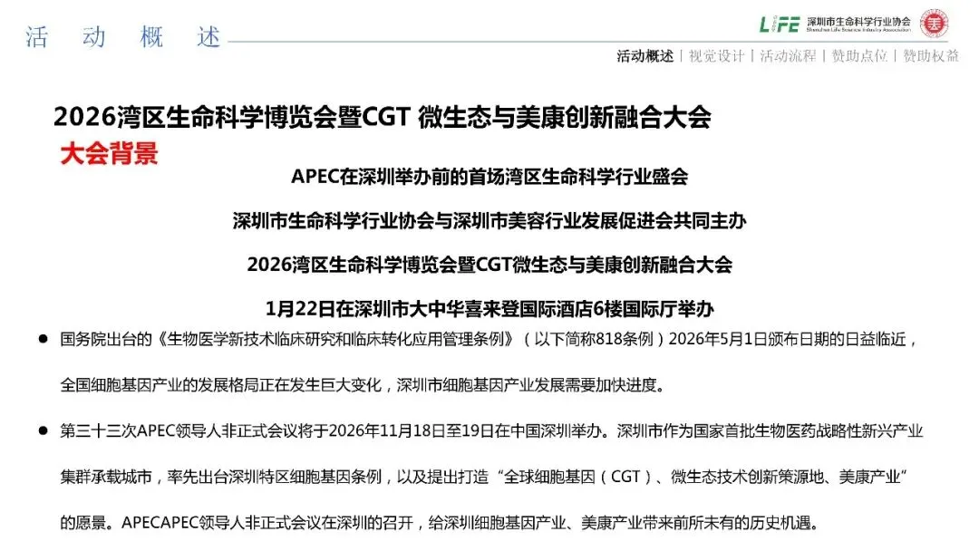 大会以“818生物医学条例解读”、“CGT产业合规创新发展”、“创新药赋能医美机构发展新范式”、“美容健康产业合规发展”为核心,围绕生命科学领域技术转化、资本协同、政策落地等关键问题,搭建集学术交流、产业合作、投融资对接及政策发布于一体的国际化平台。大会将推动国际前沿技术与深圳先行示范区制度创新深度融合,加速形成生命科学创新生态,助力深圳乃至粤港澳大湾区打造亚太乃至全球影响力的生命科学、细胞基因生物医学新技术创新高地,服务健康中国建设与高水平对外开放。