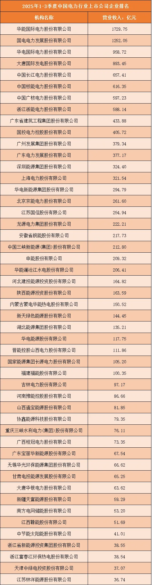 根据申万行业分类,2025年1-3季度中国电力行业上市公司按营业收入排名如下:(A股上市公司)