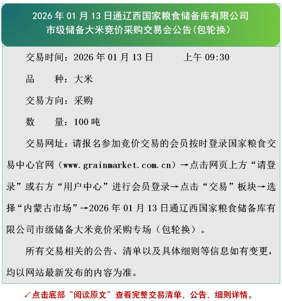 2026年01月13日通辽西国家粮食储备库有限公司市级储备大米竞价采购交易会公告(包轮换)