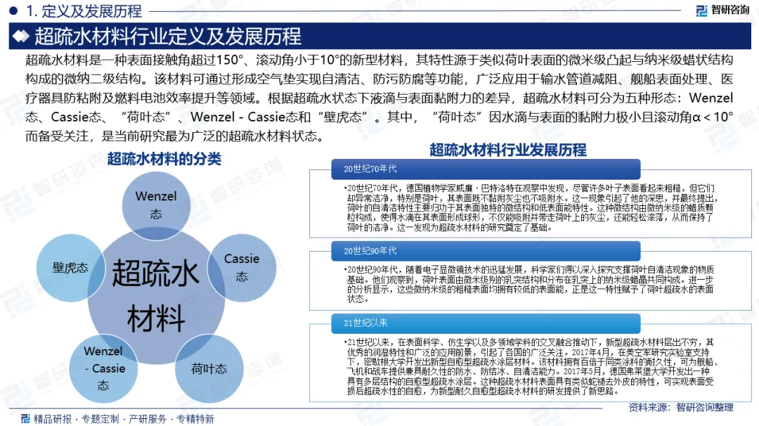 行业发展阶段:20世纪70年代,德国植物学家威廉·巴特洛特在观察中发现,尽管许多叶子表面看起来粗糙,但它们却异常洁净,特别是荷叶,其表面既不黏附灰尘也不吸附水。这一现象引起了他的深思,并最终提出,荷叶的自清洁特性主要归功于其表面独特的微结构和低表面能特性。这种微结构由微纳米级的蜡质颗粒构成,使得水滴在其表面形成球形,不仅能吸附并带走荷叶上的灰尘,还能轻松滚落,从而保持了荷叶的洁净。这一发现为超疏水材料的研究奠定了基础。20世纪90年代,随着电子显微镜技术的迅猛发展,科学家们得以深入探究支撑荷叶自清洁现象的物质基础。他们观察到,荷叶表面由微米级别的乳突结构和分布在乳突上的纳米级蜡晶共同构成。进一步的分析显示,这些微纳米级的粗糙表面均拥有较低的表面能,正是这一特性赋予了荷叶超疏水的表面状态。21世纪以来,在表面科学、仿生学以及多领域学科的交叉融合推动下,新型超疏水材料层出不穷,其优秀的润湿特性和广泛的应用前景,引起了各国的广泛关注。2017年4月,在美空军研究实验室支持下,密歇根大学开发出新型自愈型超疏水涂层材料。该材料拥有百倍于同类涂料的耐久性,可为舰船、飞机和战车提供兼具耐久性的防水、防结冰、自清洁能力。2017年5月,德国弗莱堡大学开发出一种具有多层结构的自愈型超疏水涂层。这种超疏水材料表面具有类似蛇褪去外皮的特性,可实现表面受损后超疏水性的自愈,为新型耐久自愈型超疏水材料的研发提供了新思路。