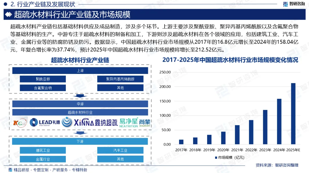 市场规模:超疏水材料是一种具有独特性质的新型材料,其灵感源于荷叶效应。这种材料在接触到水滴时,能够使其迅速滑落,展现出优异的自清洁能力。从科技前沿到日常生活,超疏水材料在多个领域展现出广阔的应用前景。它不仅能够为建筑玻璃、室外设施提供免清洗的洁净表面,还可覆盖于金属材料表面形成高效防腐蚀屏障,显著延长构件使用寿命;基于对水生昆虫的仿生学研究,该材料为研制水上行走设备乃至实现水上飞行提供了技术可能;在船舶制造领域,通过在船体覆盖超疏水薄膜,可有效降低航行阻力,实现显著的节能效益。近年来,随着纳米制备技术的突破与应用场景的持续拓展,中国超疏水材料行业实现了跨越式发展。数据显示,中国超疏水材料行业市场规模从2017年的16.8亿元增长至2024年的158.04亿元,年复合增长率为37.74%,预计2025年中国超疏水材料行业市场规模将增长至212.52亿元。未来,随着材料耐久性持续提升、生产成本逐步优化,以及在新能源、海洋工程与柔性电子等新兴领域融合深化,中国超疏水材料行业有望延续高增长态势,成为推动新材料产业创新与实现绿色可持续发展的重要力量。
