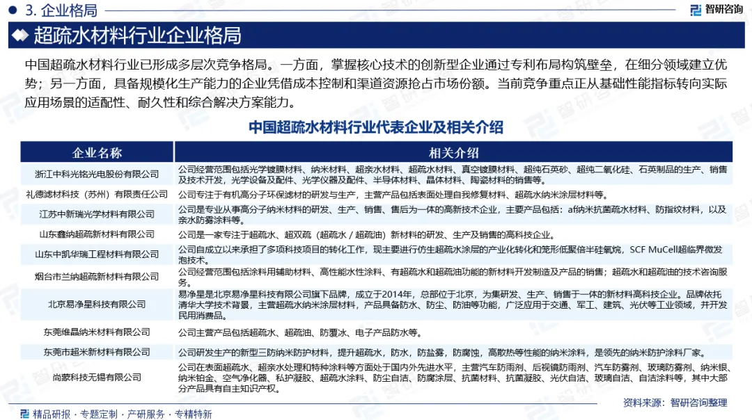 企业格局:中国超疏水材料行业已形成多层次竞争格局。一方面,掌握核心技术的创新型企业通过专利布局构筑壁垒,在细分领域建立优势;另一方面,具备规模化生产能力的企业凭借成本控制和渠道资源抢占市场份额。当前竞争重点正从基础性能指标转向实际应用场景的适配性、耐久性和综合解决方案能力。目前,中国超疏水材料行业代表企业包括浙江中科光铭光电股份有限公司、礼德滤材科技(苏州)有限责任公司、江苏中新瑞光学材料有限公司、山东鑫纳超疏新材料有限公司、山东中凯华瑞工程材料有限公司、烟台市兰纳超疏新材料有限公司、北京易净星科技有限公司、东莞维晶纳米材料有限公司、东莞市超米新材料有限公司、尚蒙科技无锡有限公司等。