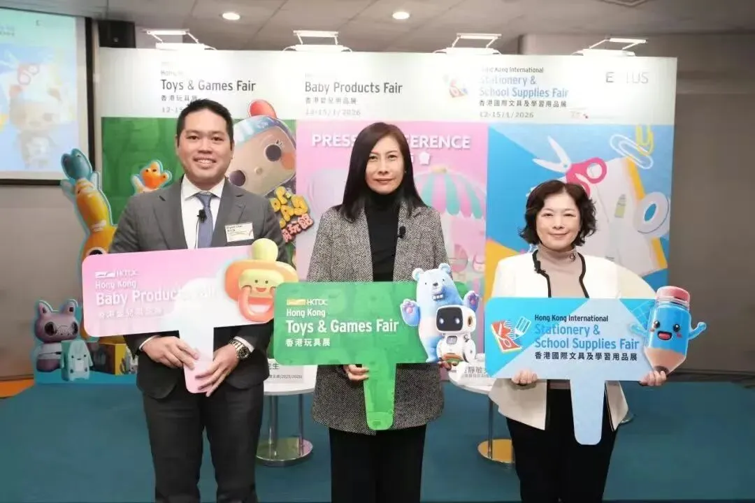 香港贸发局副总裁古静敏(中)、香港贸发局玩具业谘询委员会主席陈允诚(左)及法兰克福展览(香港)有限公司副总经理张菁(右)1月6日出席记者会,介绍玩具展、婴儿用品展及国际文具及学习用品展的精彩内容及创意产品。
