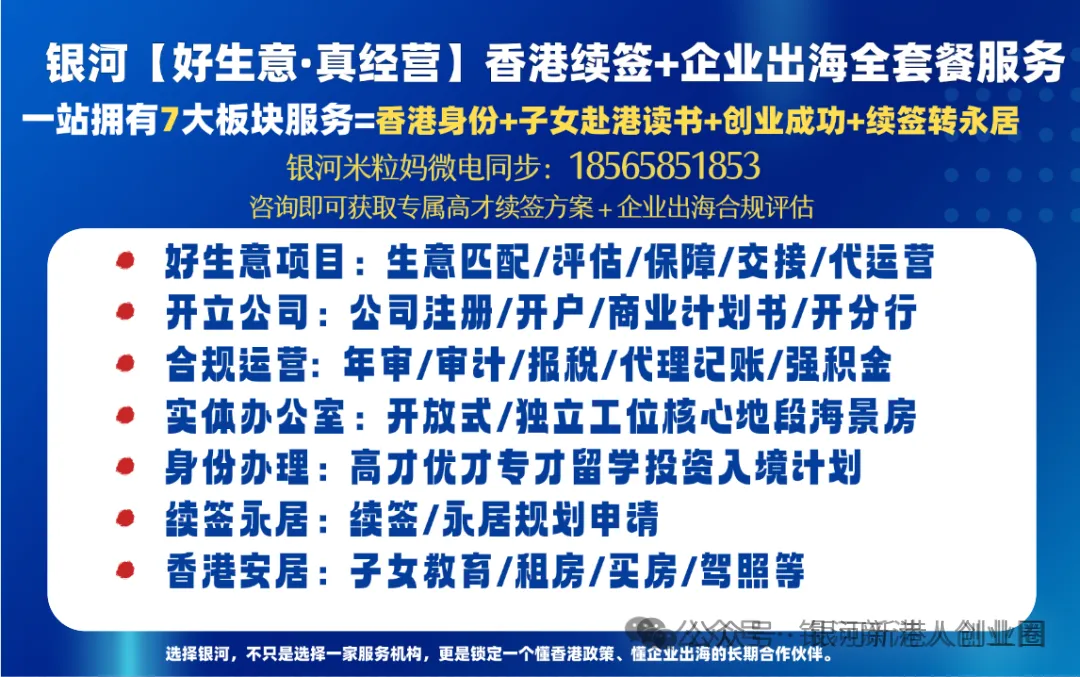 选择银河,不只是选择一家服务机构,更是锁定一个懂香港政策、懂企业出海的长期合作伙伴。现在咨询,即可获取专属高才续签方案 + 企业出海合规评估!如果你想要了解银河【好生意·真经营】可以加我微信详细了解(18565851853 &17675416895)