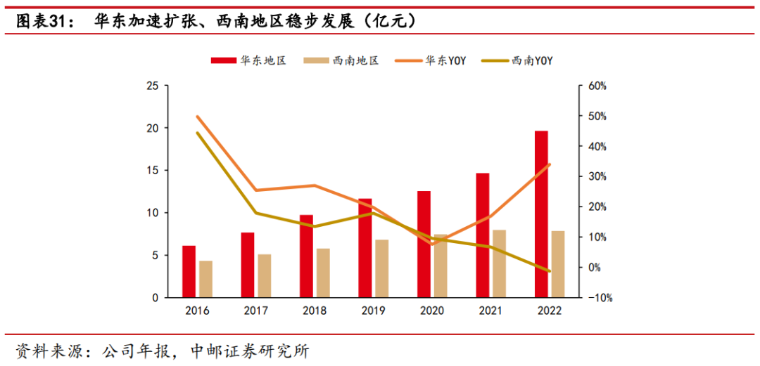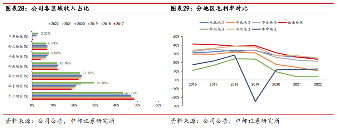 北方地区成熟市场收入增速放缓,利润有望维持较高水平。东北地区是公司大本营市场,贡献公司近半的收入和大部分的利润,2022年营业收入28.93亿元,2017-2022年期间营收CAGR为7.84%。在保持中心城市高市占率的同时,未来增长更多来自乡镇网点开发。沈阳和长春生产基地建设完成后,东北地区将新增产能约12万吨,公司在东北市场地位将更为稳固