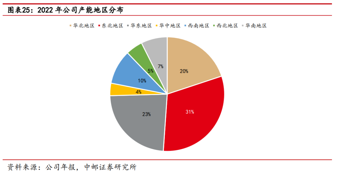 公司目前产能储备充足,主要集中在东北、华北和华东地区。截至2022年,公司实际可用产能高达45.5万吨,目前在建的6个生产基地计划总产能达30.89万吨,华东、华南、西南地区产能将逐步释放,扩大产能一方面将更好地与下游增长的需求相匹配,保持并扩大市场份额,另一方面可以通过扩大生产提升规模效应,在基础薄弱地区更好推进性价比竞争战略。目前已投入使用的生产基地整体产能利用率为 81.39%,目前如华中地区等投产时间较短的生产基地因处在过渡期产能利用率较低,未来有较大的提升空间,而相对成熟的东北、华北基地产能利用率均在85%以上。