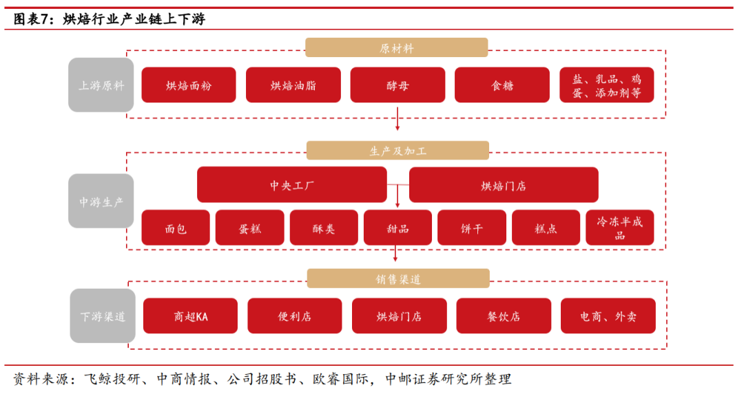烘焙行业上游为原材料供应商,其中核心原料主要为烘焙面粉、油脂、食糖、酵母、乳制品等。中游主要为生产加工环节,从业态看主要分为中央工厂以及烘焙门店两类生产模式。下游渠道端主要为线下商超、便利店、餐饮店、烘焙门店、以及线上电商、外卖等。