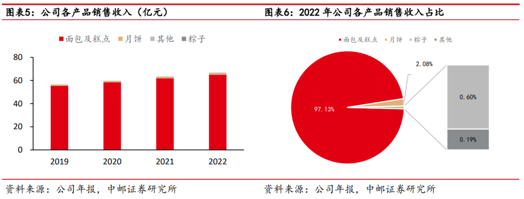 销售收入核心为面包。2022年,公司营收66.86亿元,其中面包为64.91亿元,同比增长4.90%%,占营收比重为97.13%。2017-2022年间,公司面包及糕点业务的营收和毛利占比均在97%左右,月饼和粽子作为季节性的补充业务,占比合计2-3%左右。