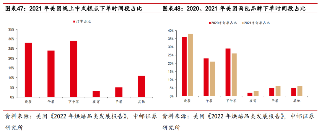 中式糕点零食化,西式烘焙正餐化,短保面包迎来更广阔消费场景。根据美团数据显示,近年新创立的网红新中式烘焙品牌如虎头局、墨茉点心局等通过产品小型化,降低饱腹感,对中式糕点进行零食化改造,将消费场景从传统中式烘焙偏正餐的属性向休闲零食、下午茶场景转变,2022年中式糕点下单时间段中下午茶场景占比29%,超越晚餐成为各细分时间段第一。同时,西式面包品类消费场景则逐渐向正餐靠近,对比看2021年较2020年晚餐场景占比提升2%,而下午茶场景下滑3%,面包正餐化趋势给短保面包带来更为广阔的消费场景和需求空间。