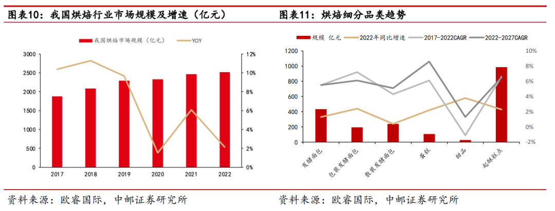 我国烘焙行业前景广阔。烘焙食品主要包含西式的面包、蛋糕、饼干、馅饼以及中式传统糕点如月饼、糕点等,当前市场规模在达到2500亿左后趋于稳定。中国烘焙行业整体发展时间较短,在20世纪末呈现快速发展趋势。根据欧睿国际的数据,2017-2022年烘焙规模CAGR为6.1%,是食品饮料行业中成长较快的板块之一。2022年行业规模达2519亿元,根据欧睿国际预测,2022-2027年行业复合增速在疫后将回升至7.22%,2024年中国烘焙市场规模有望接近3000亿元。