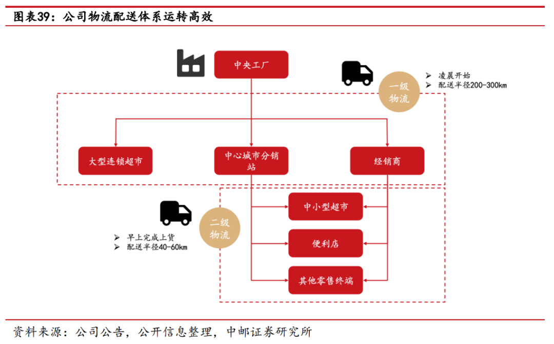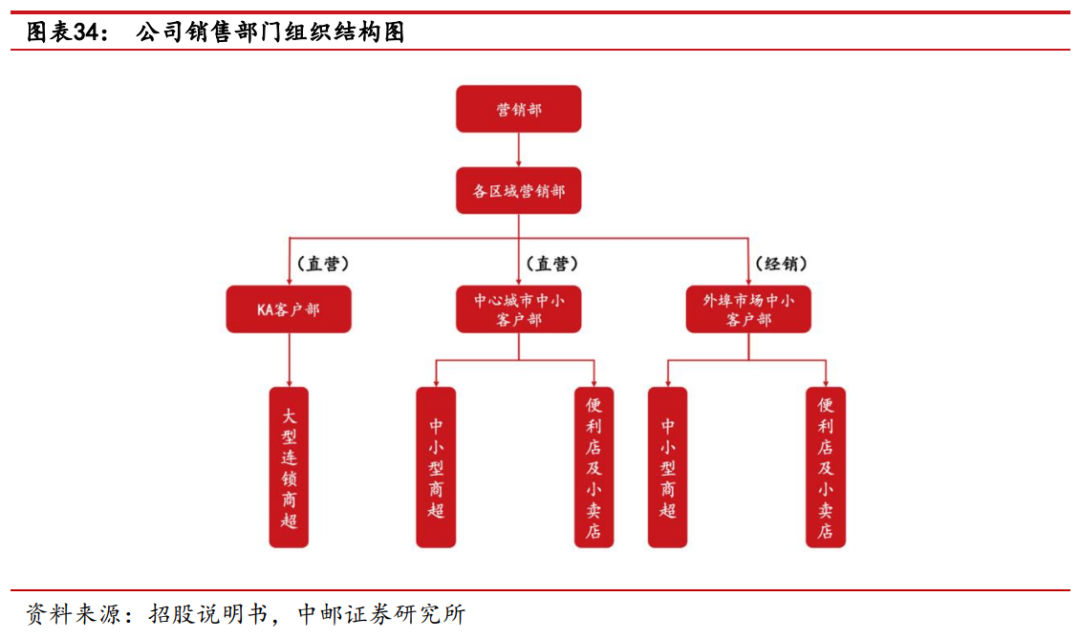 公司以直营为主,经销作为打开外埠市场的补充。公司主要通过直营和经销两种模式进行销售:一是针对大型连锁商超(KA客户)和中心城市的中小超市、便利店终端,公司直接与其签署协议销售产品的模式;二是针对外埠市场的便利店、县乡商店、小卖部,公司通过经销商分销的经销模式。近年公司直营收入占比维持在62%左右,直营模式能够保证长期跟踪产品的运输和销售情况,经销作为补充,是打开外埠市场的方式,未来伴随全国化建厂后工厂覆盖范围扩大,直营将更加经济。