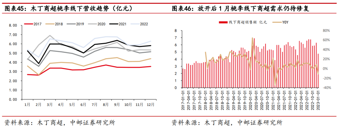 桃李需求端总体具有韧性,但仍待复苏。根据木丁商超数据,疫情三年期间,桃李在KA商超端需求较为稳定,2020-2022年销售额分别为67/67.4/72.6亿元。从近期看,疫情放开后的短期冲击以及1月过年较早,桃李线下商超销售额同比下滑11%,但预计在节后复工、学生开学催化下,2月起需求端逐渐复苏。
