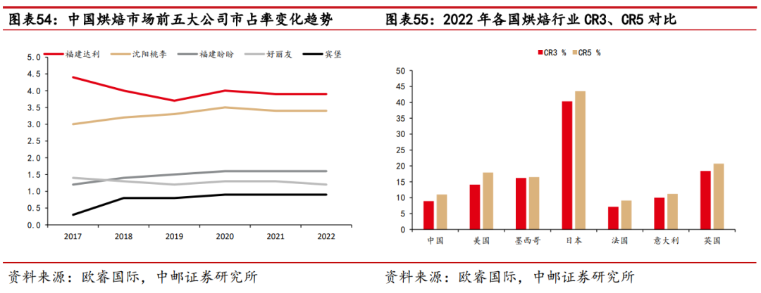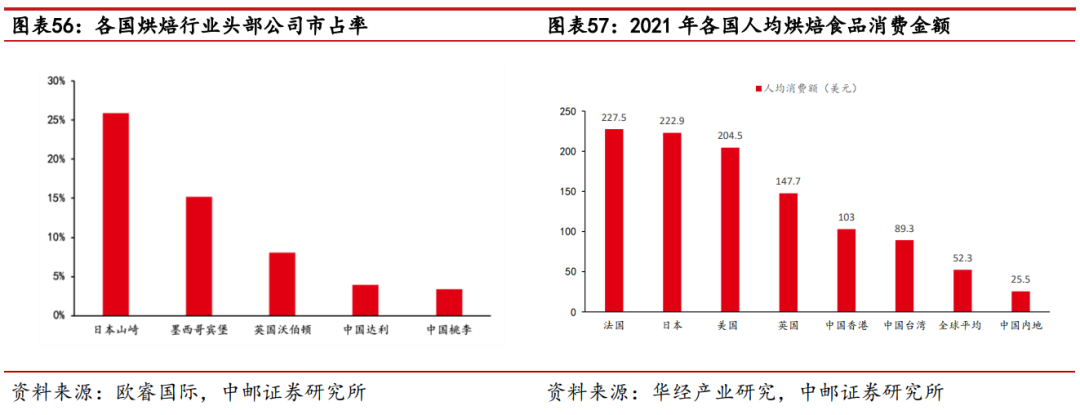 我国烘焙食品人均消费偏低,需求规模还有较大增长空间。从人均消费额来看,2021年中国内地人均烘焙食品消费额仅为25.5美元,世界平均为52.3美元,饮食习惯相近的日本为222.9美元,而西方国家如法国人均烘焙食品消费额为227.5美元。据此推算,我国烘焙市场规模仍有数倍提升空间,未来在西式饮食习惯渗透和休闲需求持续增长的背景下,烘焙行业有望持续扩容。