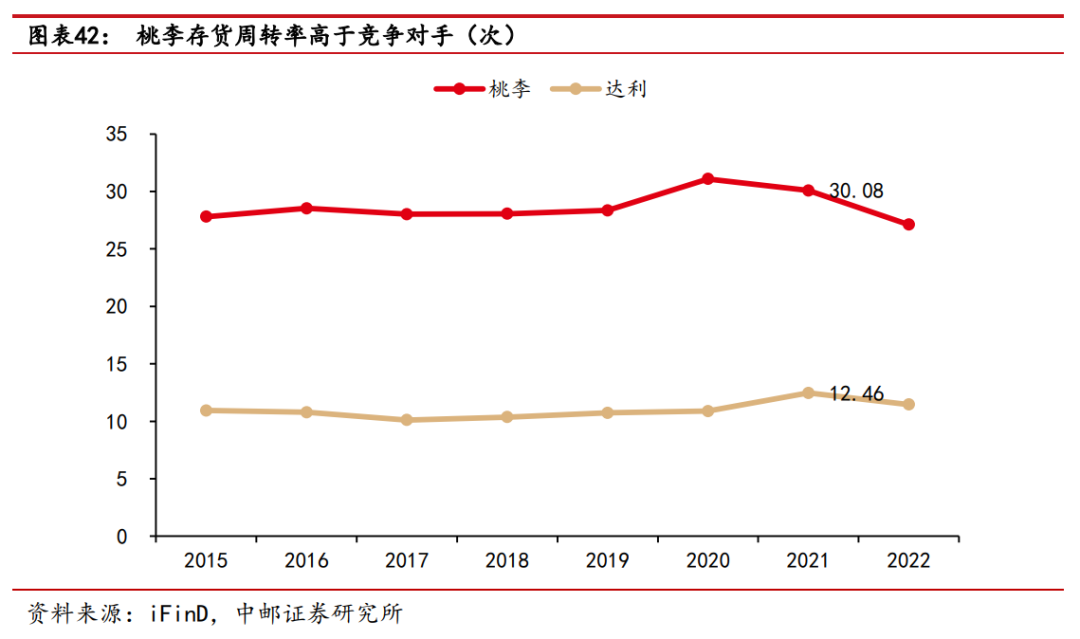 生产销售环节高效运转和物流配送体系完善,公司存货周转率逐年提升。公司的生产销售模式和高效配送体系带来比竞争对手更完善的供应链,能及时将产品送达终端网点分销,当前在东北等成熟市场均能完成日配。公司存货周转率行业领先,2022年在疫情封控扰动下仍达27.11次,远高于竞争对手达利食品的11.46次。