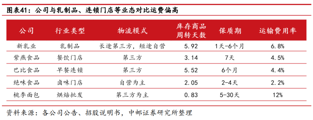 对比其他食饮行业高周转公司,桃李运输费用率相对偏高。对比食饮行业其他高周转业态如生鲜乳制品、餐饮门店、连锁餐饮等,桃李运输费用率仍然较高。2021年,新乳业/紫燕/巴比/绝味运输费用率分别为6.8%/4.5%/4.4%/2.2%,均远低于桃李面包的12%。我们认为,桃李面包由于主要采用第三方运输配送,同时周转天数较其他业态更低,因此整体配送费用偏高。未来,我们认为公司可对标新乳业(新乳业低温鲜奶部分产品周转天数为1天),运输费用率仍有改善空间。