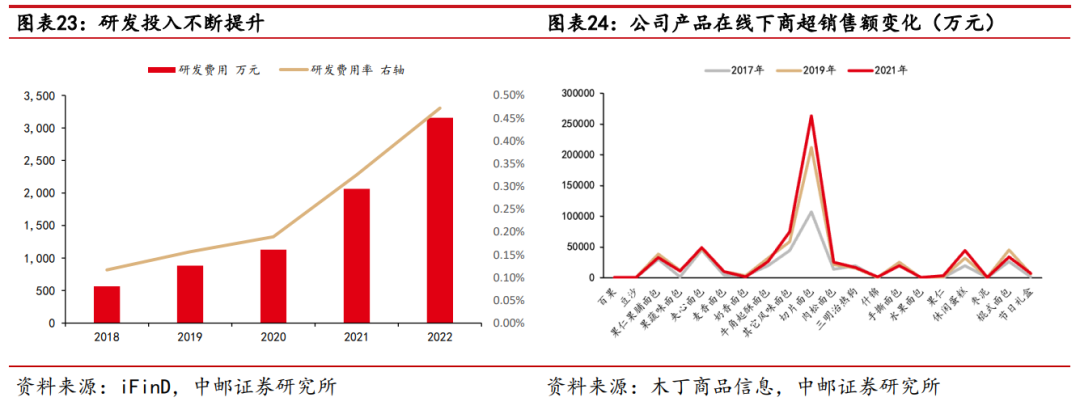 公司在华北地区凭借高性价比和供应链优势取得领先地位,2022年华北地区收入规模19.64亿元,2017-2022年期间CAGR为11.08%。因华北地区短保竞争者众多,公司费用投放较东北地区更高,但盈利能力依旧稳健,且华北市场容量和消费水平高于东北,预计未来仍能具备强劲的增长势头。