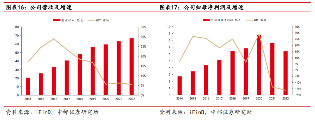 公司2022年需求盈利承压,2023年预计逐季复苏。公司营业收入从2014年的20.58亿元增长到2022年的66.86亿元,近5年CAGR为10.38%,保持高于行业的增速。2020至2022年,疫情反复,各地封控影响公司产品配送运输,同时终端渠道门店客流下滑影响消费需求,公司增速放缓,同比增长在6%左右。公司归母净利润从2014年的2.73亿元增长至2022年的6.40亿元,近5年CAGR为4.51%。2021、2022年受疫情封控等因素影响,公司净利润在上市后首次呈现负增长。看2023年,预计在疫后复苏催化下,营收有望重回双位数增长,同时净利润预计也将重回增长趋势。