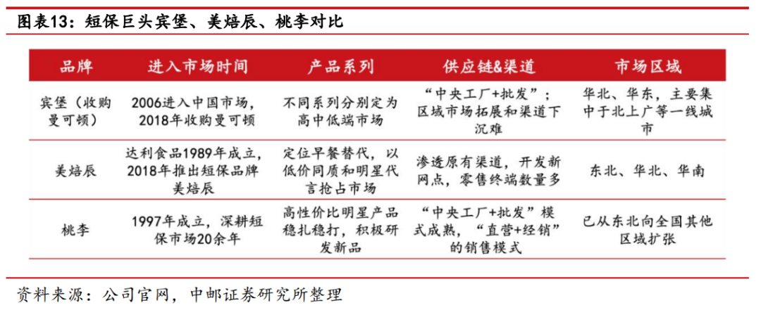 目前桃李主要竞争对手为外资品牌宾堡、曼可顿和国内品牌美焙辰。美焙辰为中国烘焙龙头达利集团于2018年推出的短保品牌,其聚焦早餐家庭消费市场,以微弱价格优势拓展市场;宾堡是全球最大的食品烘焙企业,进入中国市场数十年,通过收购曼可顿等公司提升其在国内市场影响力,其品类丰富但渠道布局主要集中在高线城市,尚未进行下沉。