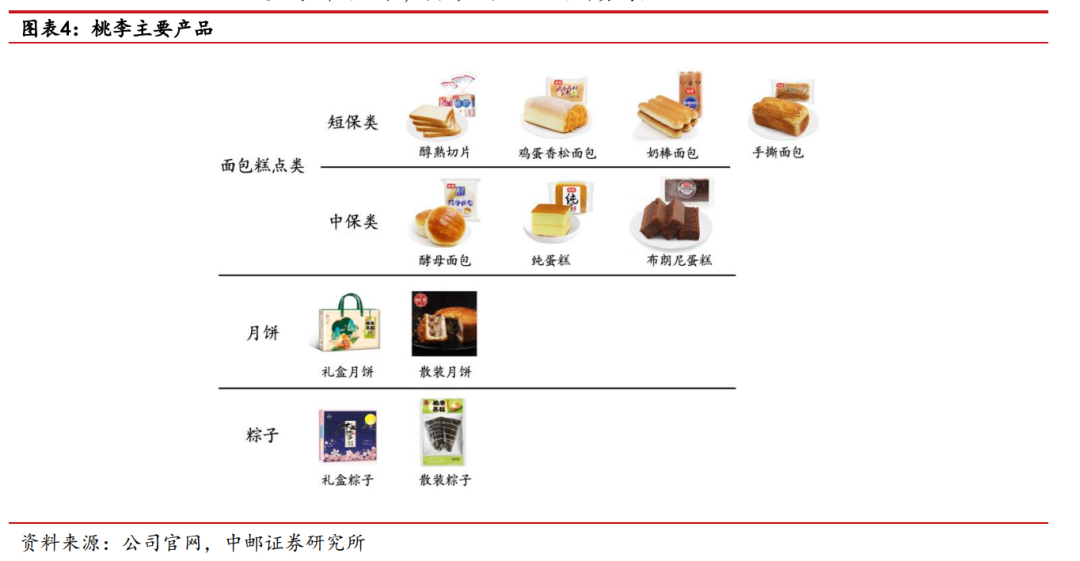 短保面包是公司的核心产品。公司主要产品包括面包、月饼、粽子三类,其中核心产品是桃李品牌的面包,而月饼和粽子则为针对传统节假日开发的时令节日产品,进一步丰富公司的产品结构。