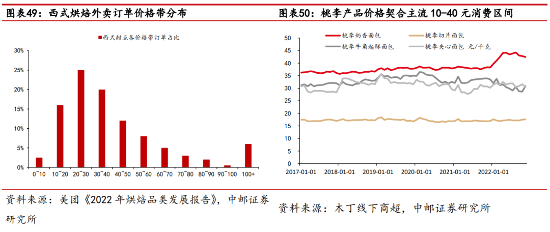 西式烘焙外卖订单价格带仍在10-40元区间,桃李产品契合主流消费区间。根据美团数据,当前西式烘焙外卖订单主流价格区间仍集中在10-40元区间,合计占比近6成,其中10-20/20-30/30-40元区间分别占16%/25%/20%。从桃李当前终端销售均价看,低端切片吐司均价在15元/千克,而偏中高端的奶香面包、夹心面包等在30-40元/千克,以家庭为消费个体,假设单次购买为1千克(约2袋切片吐司),桃李产品均价契合主流消费区间。