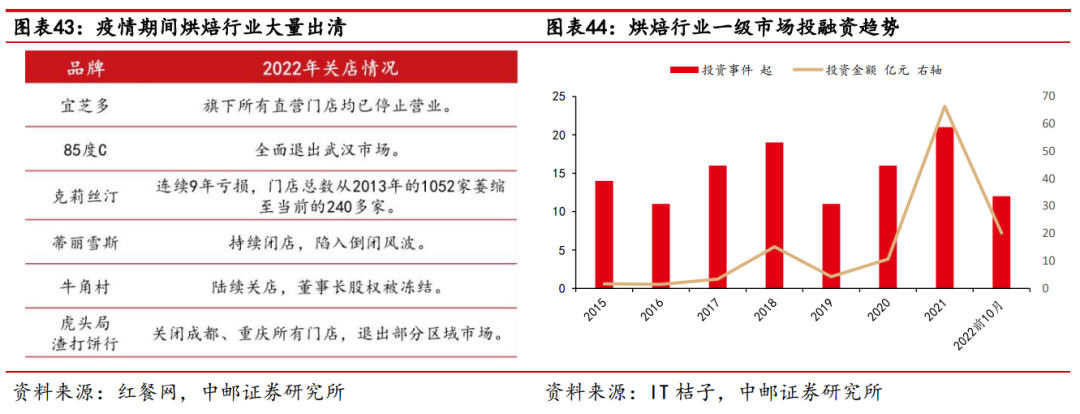 中式烘焙门店业态风口消退。2022年疫情带来的人流不确定性以及消费力下滑导致此前火热的中式网红风格烘焙门店业态受损,行业大量品牌出清。其中,虎头局等近年崛起的网红品牌陆续关店并退出部分区域市场,而行业传统西式老牌连锁品牌85度C、克莉丝汀等也受影响,继续关店收缩。从2015年起烘焙行业投融资事件看,2021年行业融资达到巅峰,全年投融资21起,金额达66.37亿元;而2022年前10个月投融资降至12起,金额回落至20亿,行业风口消退。