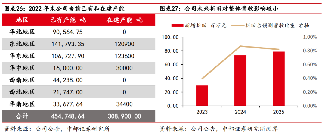 华东、东北地区新增产能均超10万吨,另外华中、华南地区也有超3万吨产能规划。从折旧看,公司产能在2024年集中释放后,预计年新增折旧在7000万左右,占营收比重在0.7%,新增折旧对盈利影响相对较小。