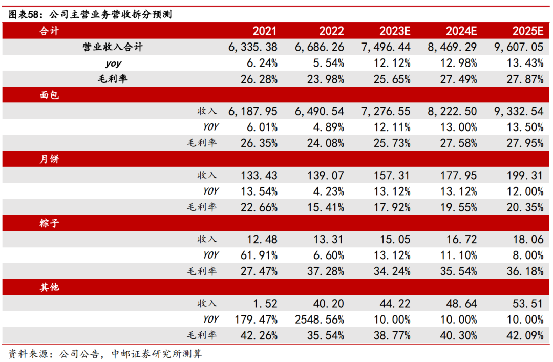 预计核心的面包业务2023-25年三年营收分别为72.77/82.23/93.33亿元,同比增速分别为12.11%/13.00%/13.50%,其中2023-25年复合增速为12.87%。