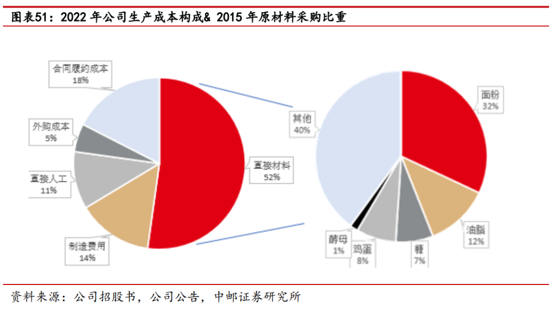 公司主要原料进入下行趋势,毛利率改善在望。公司2022年营业成本中直接材料/制造/人工/履约成本(运费)占比分别为52%/14%/11%/18%。而根据招股书数据,2015年公司原材料中面粉、油脂、糖为核心原料,成本合计占比过半,分别占32%/12%/7%。