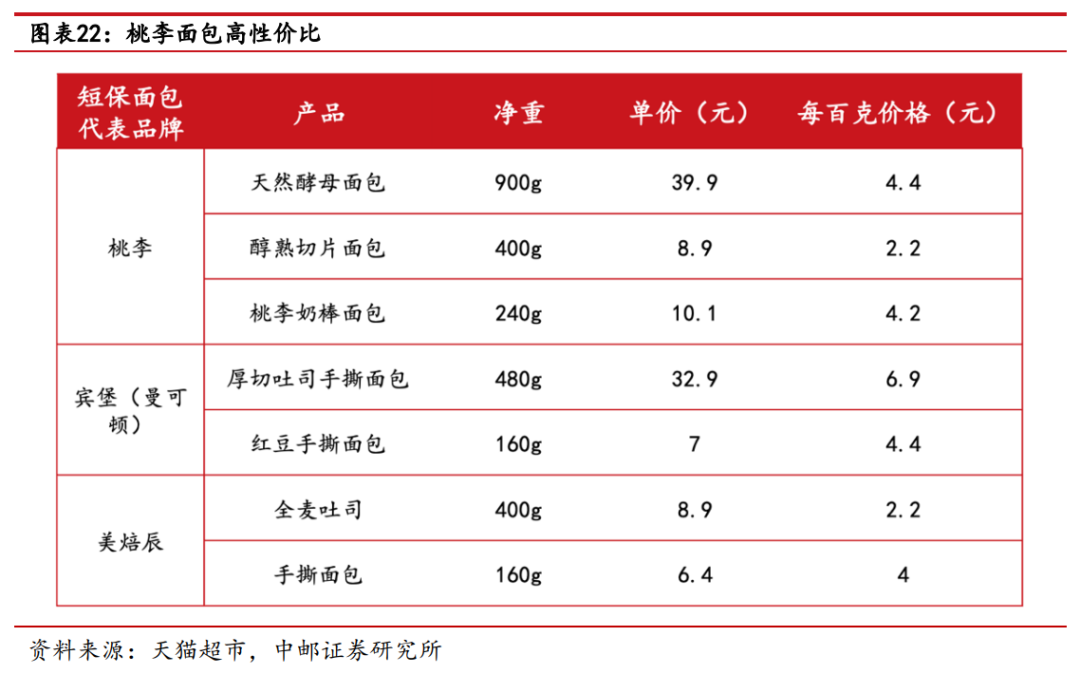 “高性价比”是桃李最重要的核心标签及品牌象征。自成立来,桃李始终以“让更多人爱上面包”为使命,主打高性价比大众路线,将明星产品大规模生产带来的价格优势作为公司收入增长的驱动力。与短保面包赛道主要竞争对手对比,桃李同类产品的价格显著低于外资龙头宾堡,与秉行低价营销策略而开拓短保市场的美焙辰不相上下。