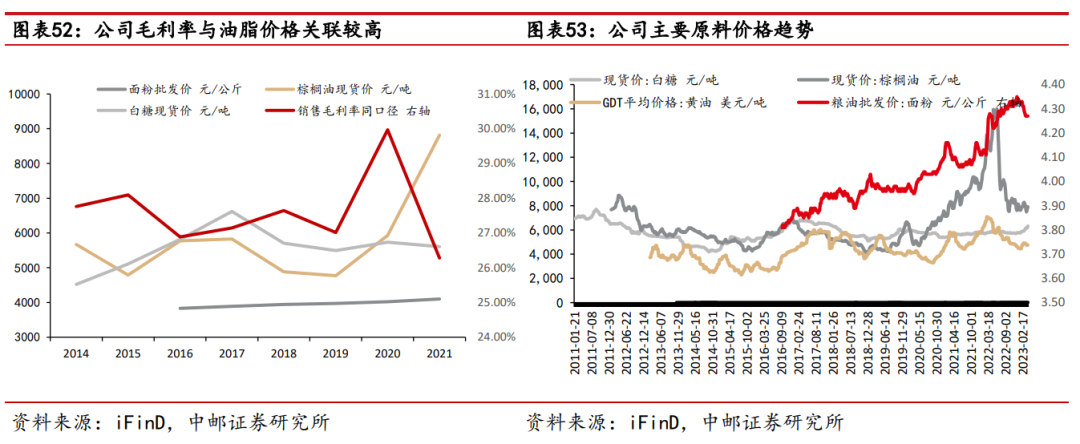 面粉、油脂、糖均已进入下行区间,2023年毛利率有望持续改善。对比公司毛利率与主要原料价格走势,由于面粉、白糖整体波动较小,公司毛利率与油脂价格有较强关联。