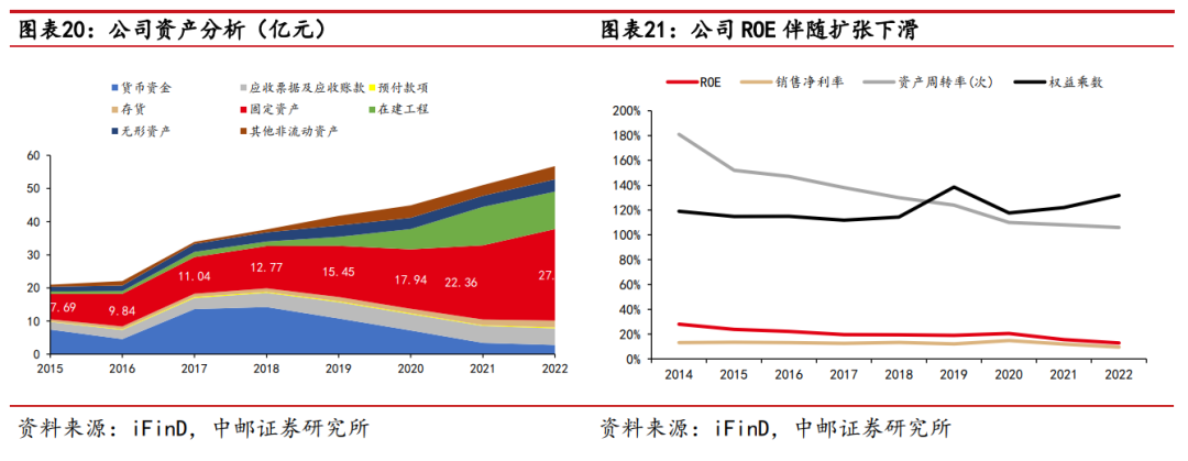 公司ROE受疫情影响以及扩张影响近年下滑,但仍处于行业较高水平。公司ROE整体处于较高水平,杜邦分析看,公司权益乘数保持稳定。2020年后ROE下降主要是由于净利润增速下滑、扩产导致的总资产周转率下降等影响,随着公司全国布局的深化,运营效率回升以及疫后修复,周转率有一定提升空间,ROE有望企稳回升。