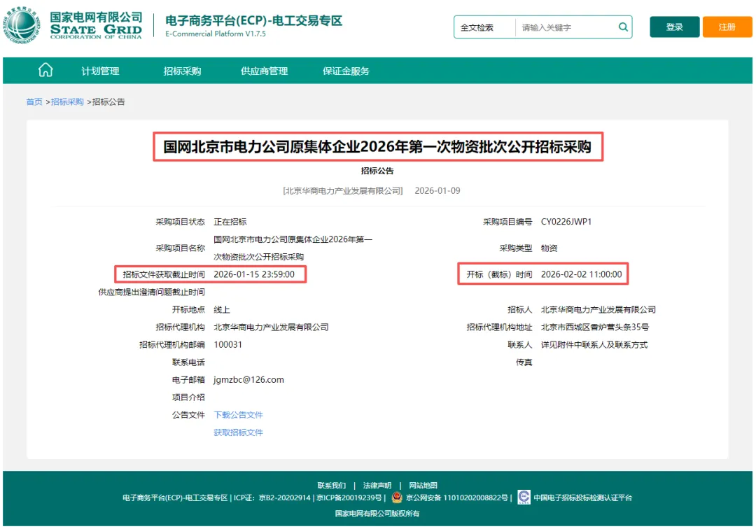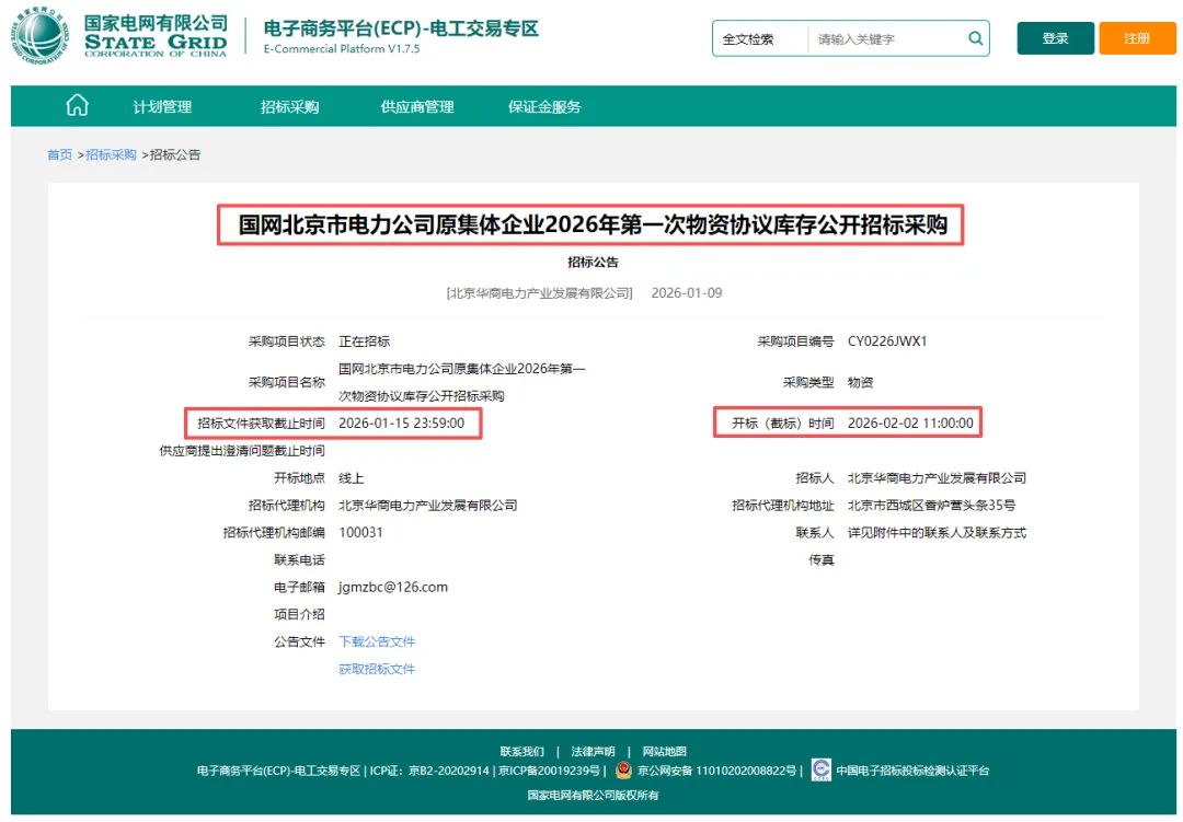 招标文件(电子文件)免费获取。凡有意参加投标者,请于2026年1月9日-2025年1月15日(北京时间,下同),登录招标人招投标交易平台信息系统(国家电网有限公司电子商务平台¨https://ecp.sgcc.com.cnþhttps://sgccetp.com.cn)获取招标文件,并按《电子招标投标办法》等国家法律法规要求,到第三方认证机构办理CA证书电子钥匙。投标人应妥善保管招标人招投标交易平台信息系统账号和密码,以及CA数字证书和密码,因上述账号、数字证书或密码保管不当造成的损失,由投标人自行承担。