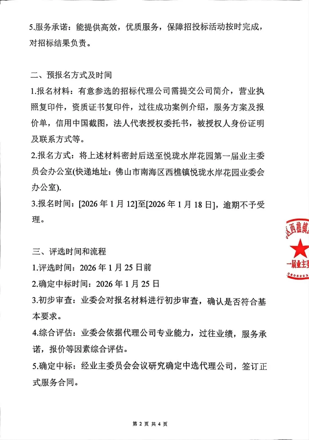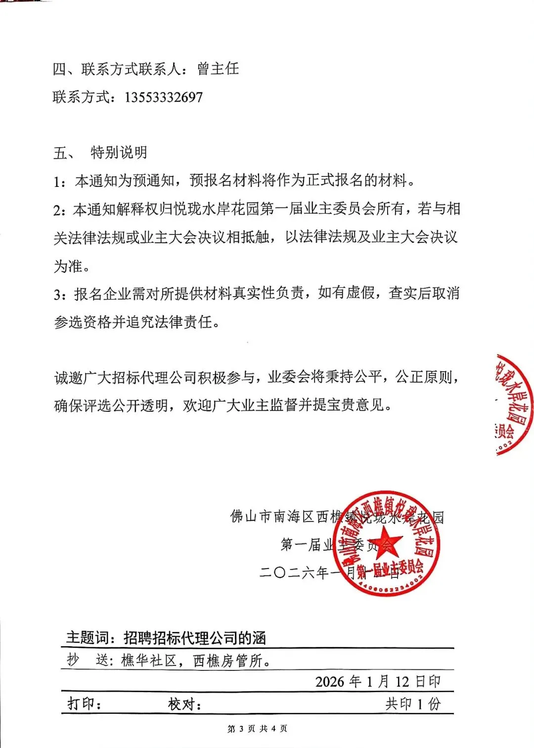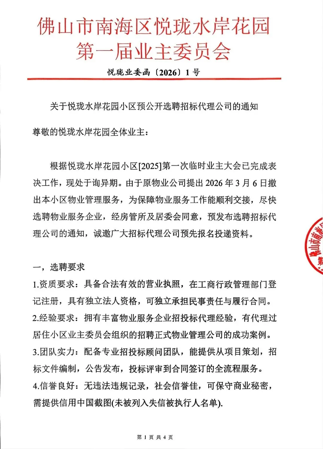 西樵悦珑水岸花园小区[2025]第一次临时业主大会已完成表决工作,现处于询异期。由于原物业公司提出2026年3月6日撤出本小区物业管理服务,为保障物业服务工作能顺利交接,尽快选聘物业服务企业,经房管所及居委会同意,预发布选聘招标代理公司的通知,诚邀广大招标代理公司预先报名投递资料。预通知公告内容如下: