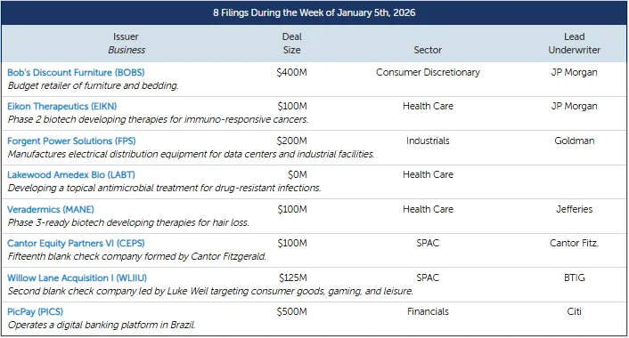 上周共有六家公司提交了IPO申请。巴西数字银行PicS(PICS)申请融资约5亿美元。平价家具零售商Bobs Discount Furniture(BOBS)申请融资约4亿美元。配电设备制造商 Forgent Power Solutions(FPS)申请融资约2亿美元。脱发生物技术公司 Veradermics(MANE)申请融资1亿美元。肿瘤生物技术公司 Eikon Therapeutics(EIKN)申请融资1亿美元。耐药感染治疗药物开发商 Lakewood-Amedex Biotherapeutics(LABT)申请在纳斯达克直接上市。