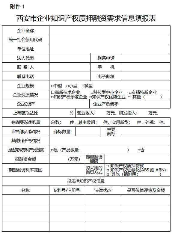 各单位要高度重视,积极参加,准确填报融资需求信息。融资需求名单后续将重点推荐为陕西省“秦知贷”知识产权质押贷款适用企业。