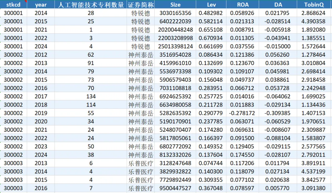 stkcd | year | 人工智能技术专利数量 | 证券简称 | Size | Lev |