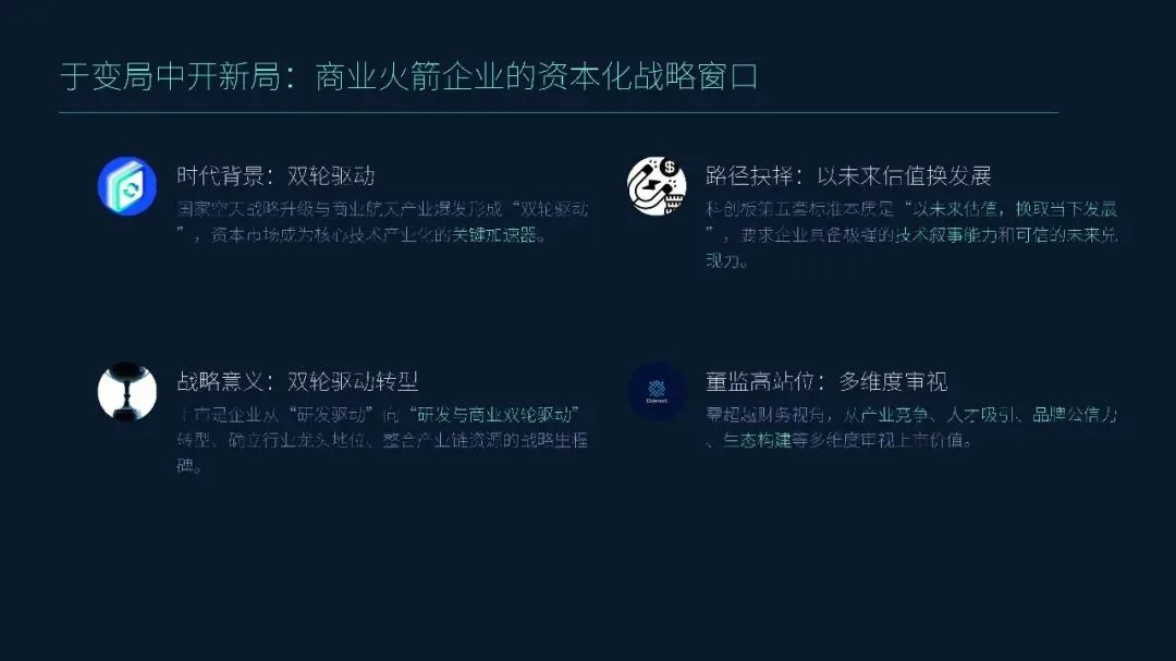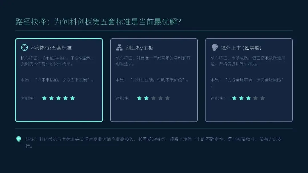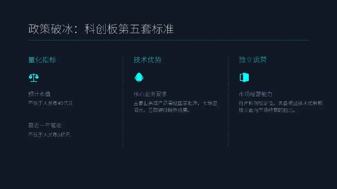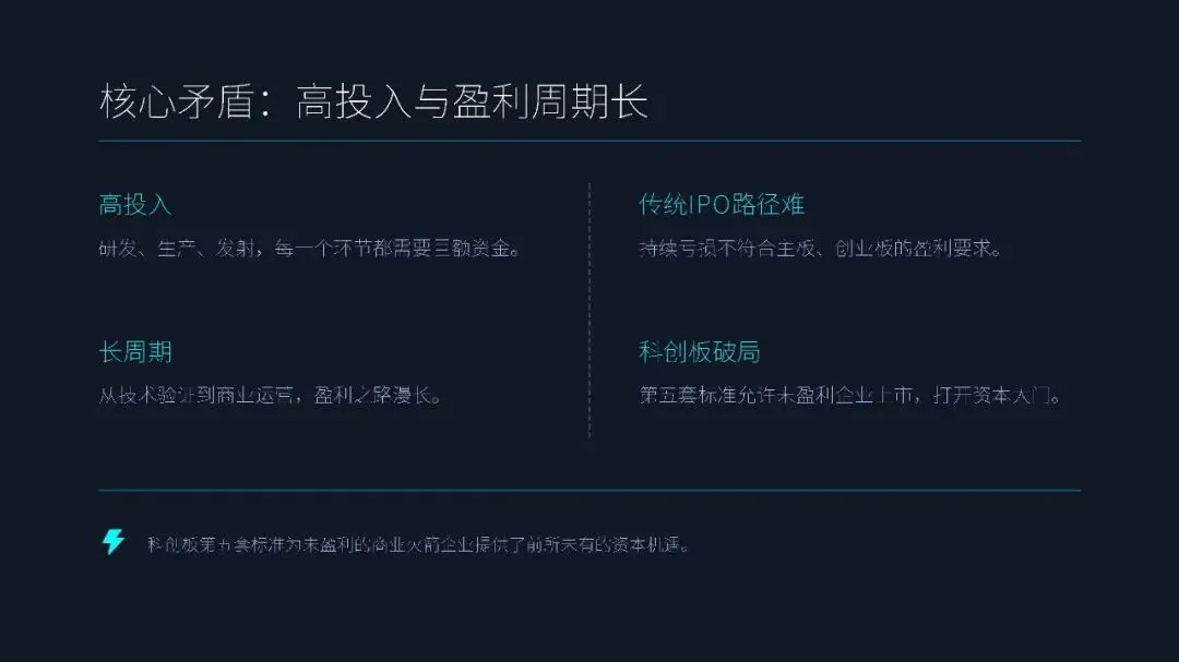 科创板第五套上市标准的核心是“市值+核心技术成果”,对收入和盈利没有硬性要求,适合研发周期长的商业火箭企业。