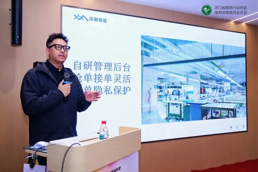 浙江服协版师发展委员会副秘书长沈鑫介绍智能服装云CAD四大优势——智能设计、改版、放码、排列,依托参数化与联动修改实现快速出版、保障品质一致;展示AI自动识别、组合、修改样版及版型设计应用路径,实现样版到工艺的数据转化。