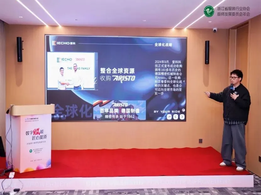 爱科浙江大区销售经理董健通过介绍爱科的国际领先设备矩阵、全球化研发与营销网络及智慧服务体系,以及视频演示智慧裁剪流程,直观展现自动裁床在版房的实际应用场景。助力版师从“传统能裁”迈向“智能精裁”新阶段。