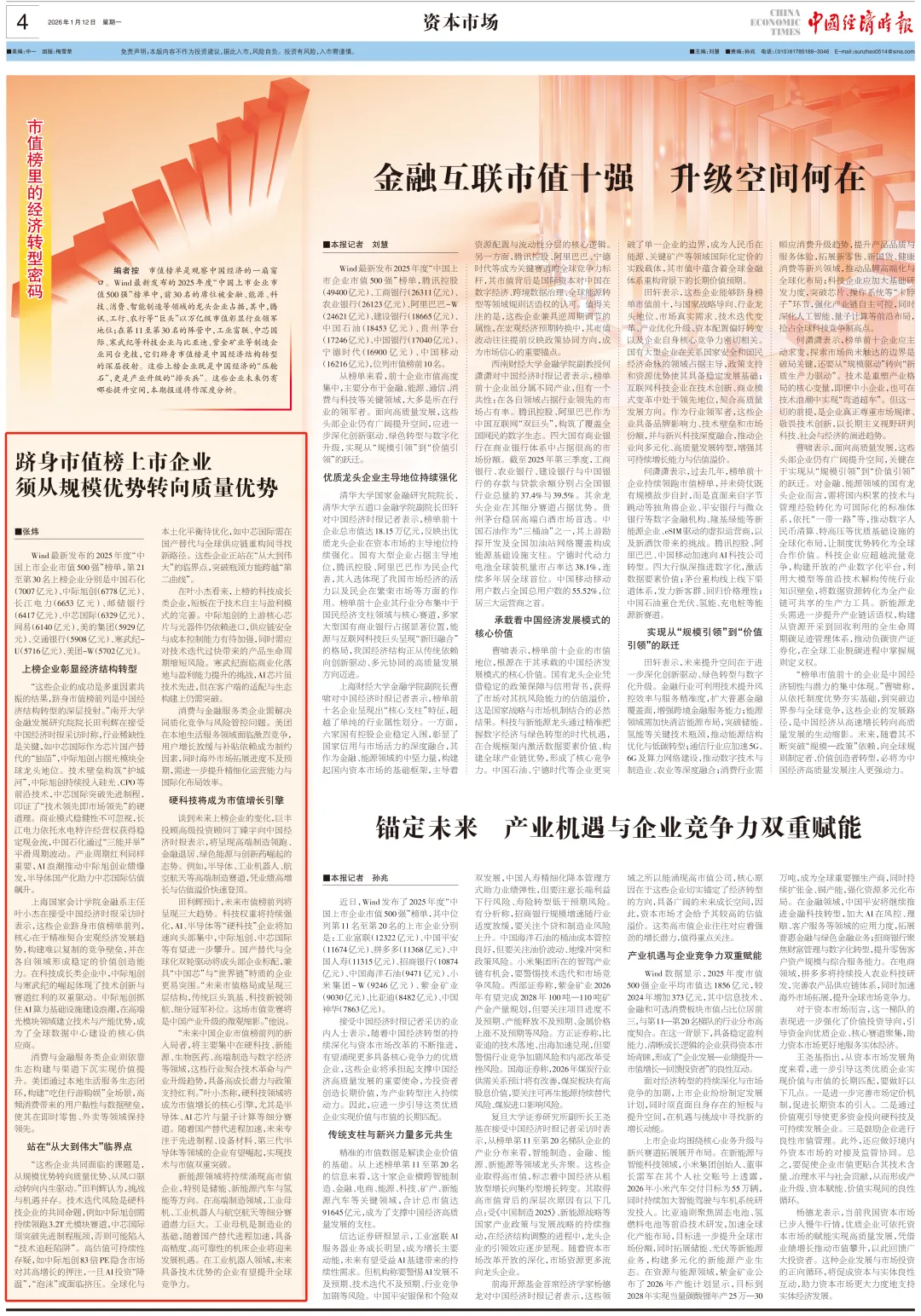 编者按 市值榜单是观察中国经济的一扇窗口。Wind最新发布的2025年度“中国上市企业市值500强”榜单中,前30名的席位被金融、能源、科技、消费、智能制造等领域的龙头企业占据,其中,腾讯、工行、农行等“巨头”以万亿级市值彰显行业领军地位;在第11至第30名的阵营中,工业富联、中芯国际、寒武纪等科技企业与比亚迪、紫金矿业等制造企业同台竞技,它们跻身市值榜是中国经济结构转型的深层投射。这些上榜企业既是中国经济的“压舱石”,更是产业升级的“排头兵”。这些企业未来仍有哪些提升空间,本期报道将作深度分析。