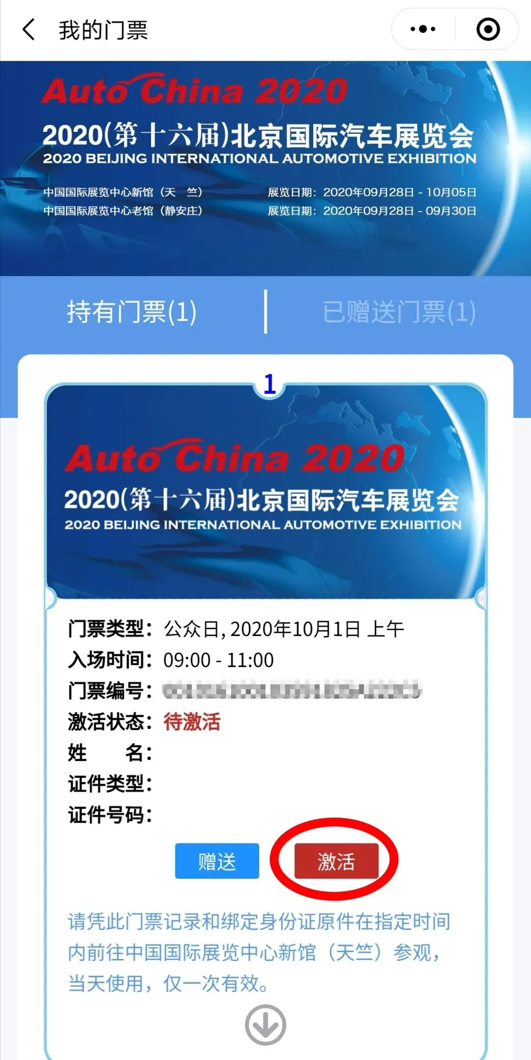 激活方法:打开微信—关注“北京国际汽车展览会”公众号—观众—新馆购票—打开“北京国际车展票务”小程序—手机号授权登录—我的门票—激活—可选择为本人激活门票或为他人激活门票,如果为他人激活门票,需要将激活后的界面截屏给使用人,使用人凭激活信息和本人身份证入场。