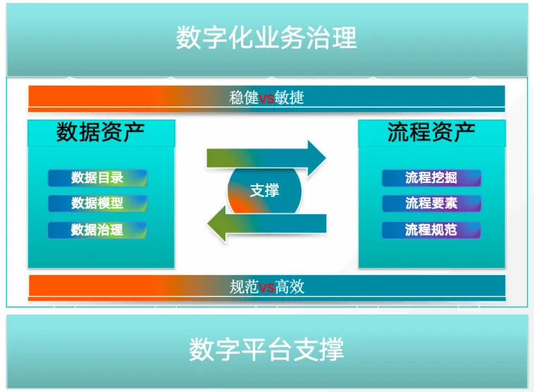 数据通过数据治理形成数据资产,流程通过流程治理形成流程资产,概括下来业务通过数字化治理形成数字化业务资产。