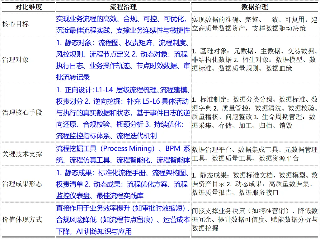 二者的差异源于治理对象的本质属性不同 —— 数据是静态的、结构化的信息载体,流程是动态的、跨节点的业务链路,这种差异决定了治理目标、方法、成果的全方位区别。
