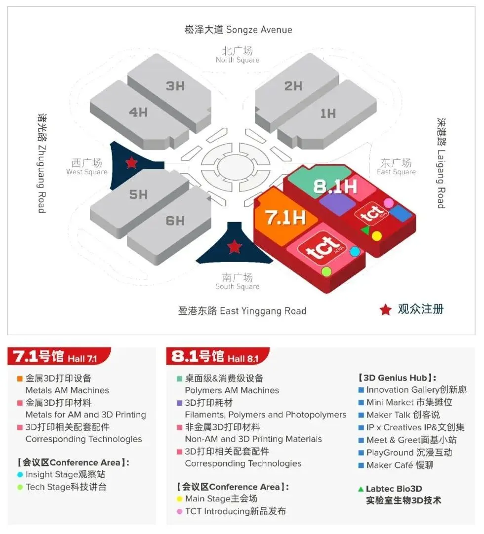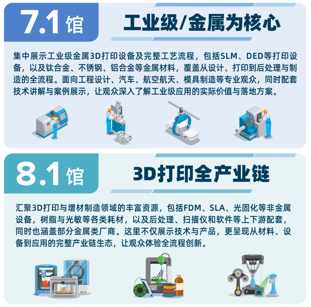 为了让每一位到场观众都能“看得准、逛得快、收获多”,TCT亚洲展为大家精心规划了观展路线。2026年将延续清晰的展区分布,7.1号馆聚焦金属增材制造的完整链条,包括金属3D打印设备、金属材料以及后处理与配套方案,方便来自航空航天、汽车、模具、能源装备等领域的观众快速对接工业级解决方案。8.1号馆则覆盖3D打印全产业链,包括非金属设备、多材料体系及丰富的落地应用,从材料与设备到完整的产业链生态,为观众提供一站式体验。