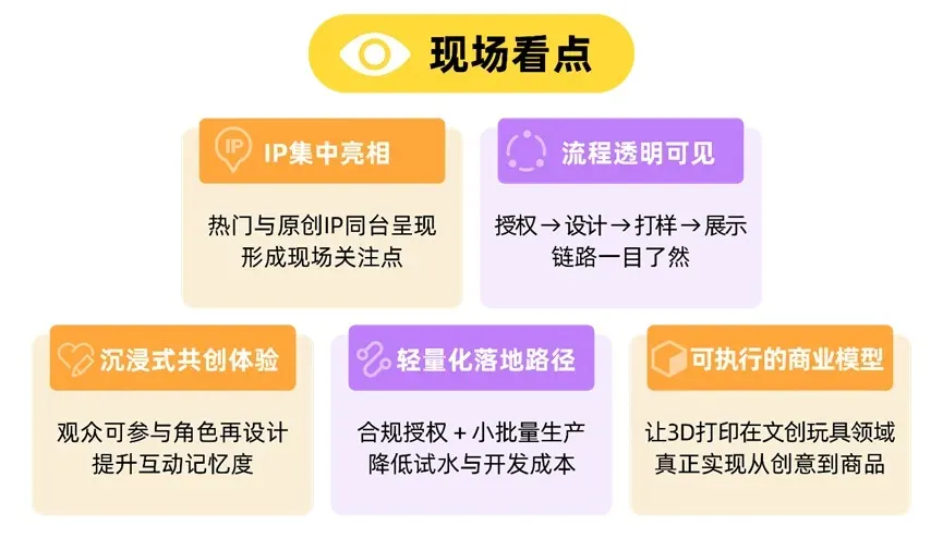 本届展会现场将联合IP授权相关组织、文创工作室与玩具品牌,共同打造 “IP&文创集”互动区 ,呈现从角色设定、快速打样到小批量生产的完整链路,并由授权服务机构提供合规与合作流程指导,帮助创作者与企业更直观地理解IP如何从灵感走向真正的产品化与商业落地。