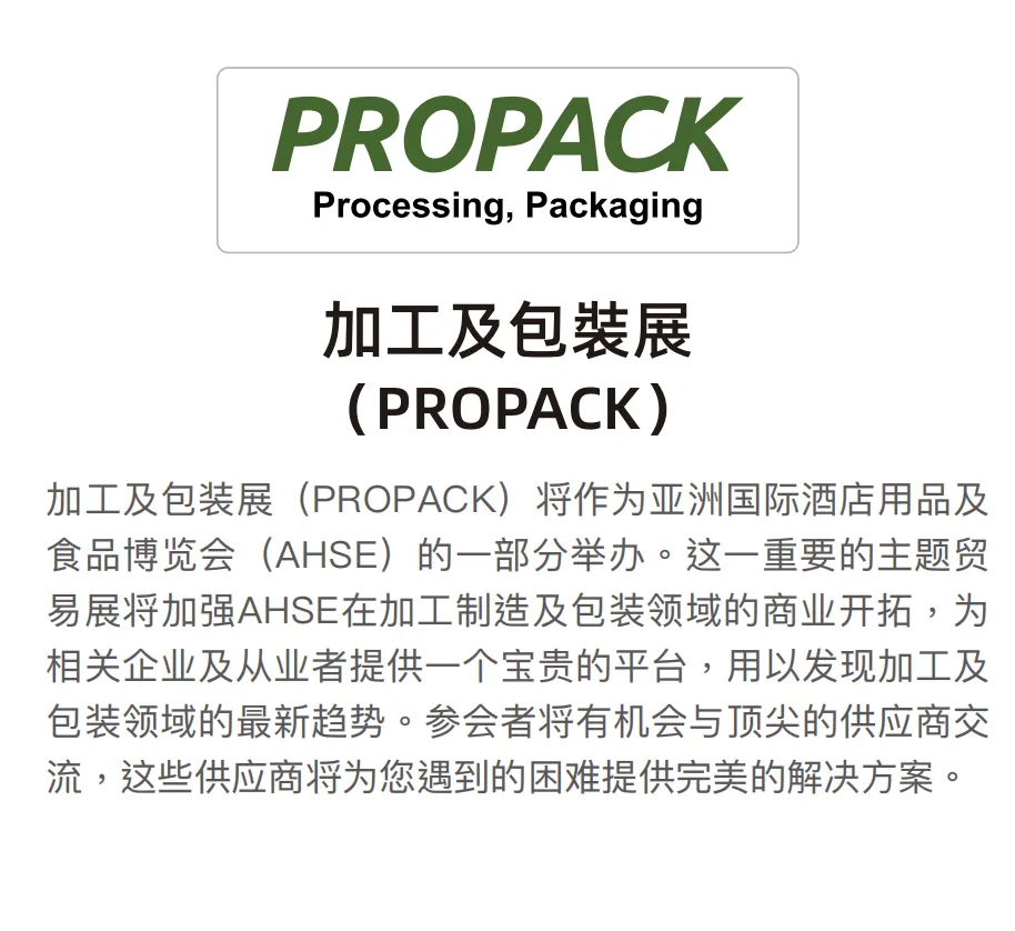 2026年,AHSE迎来重磅升级。亚洲国际食品饮料博览会(FBAF)、加工及包装展(PROPACK)、酒店饭店及餐饮展(HORECA)、亚洲国际农业与畜牧业博览会(AGROWORLD)四大专业展会,均为AHSE 2026的核心组成板块。
