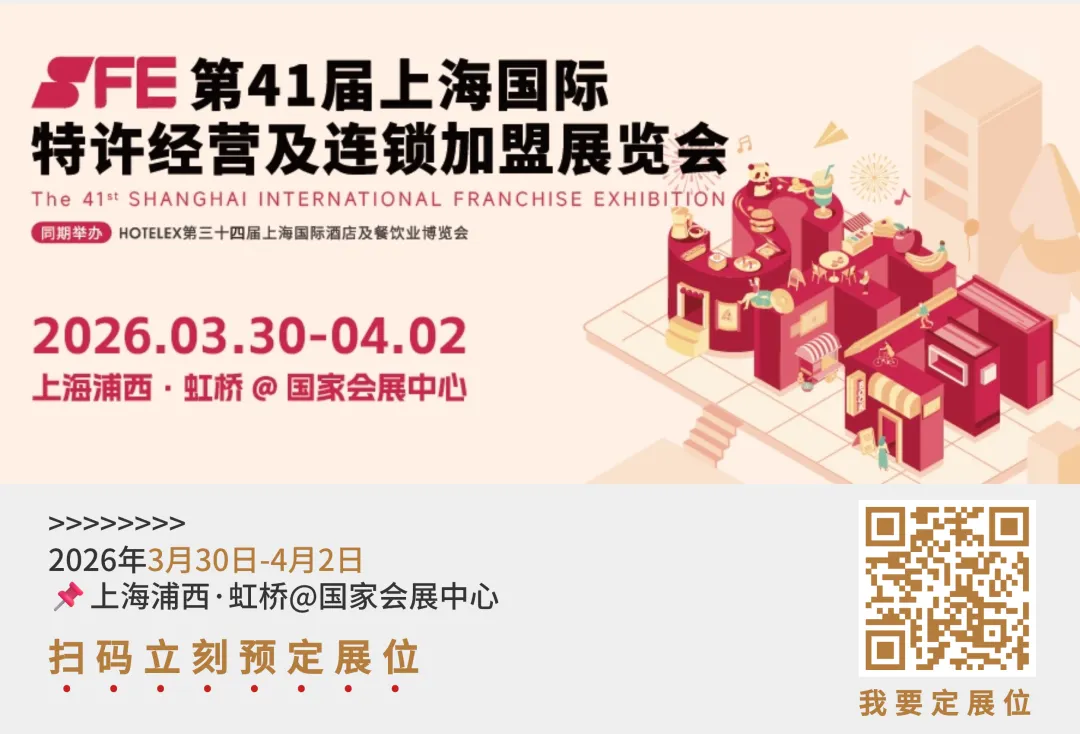 2026年3月30日-4月2日,SFE第41届上海国际特许经营及连锁加盟展览会将深度融合第三十四届上海国际酒店及餐饮业博览会,高效整合连锁行业优质稀缺资源。诚邀您于2026年再聚上海,共探新机,再创辉煌!
