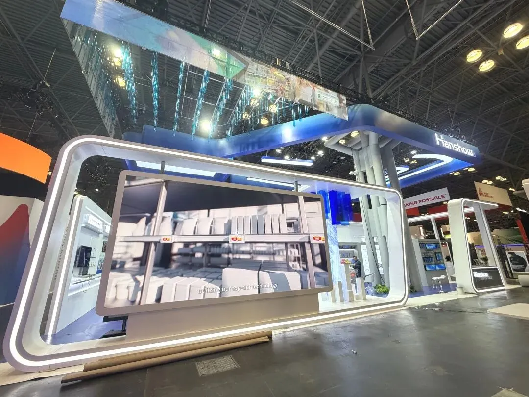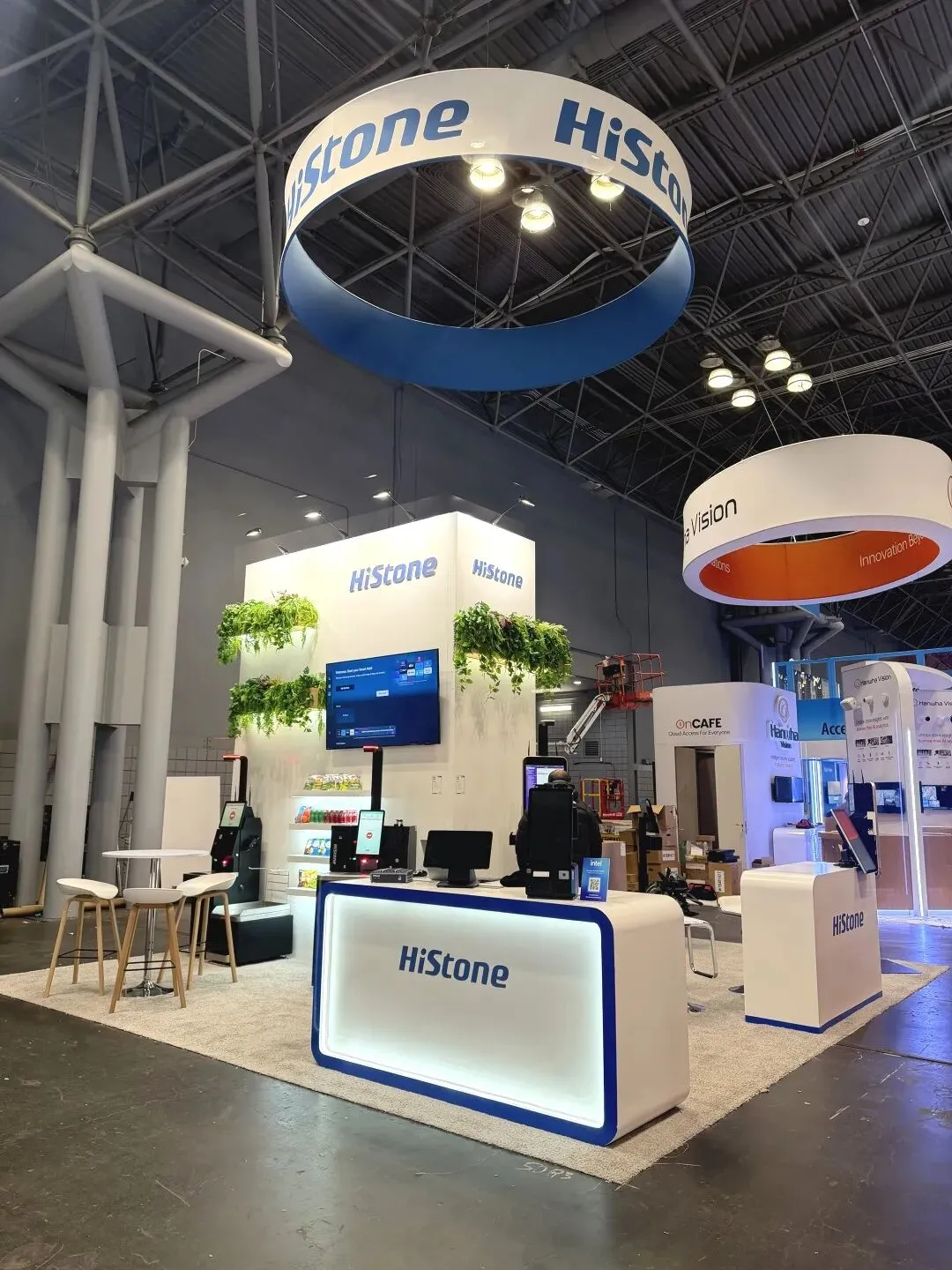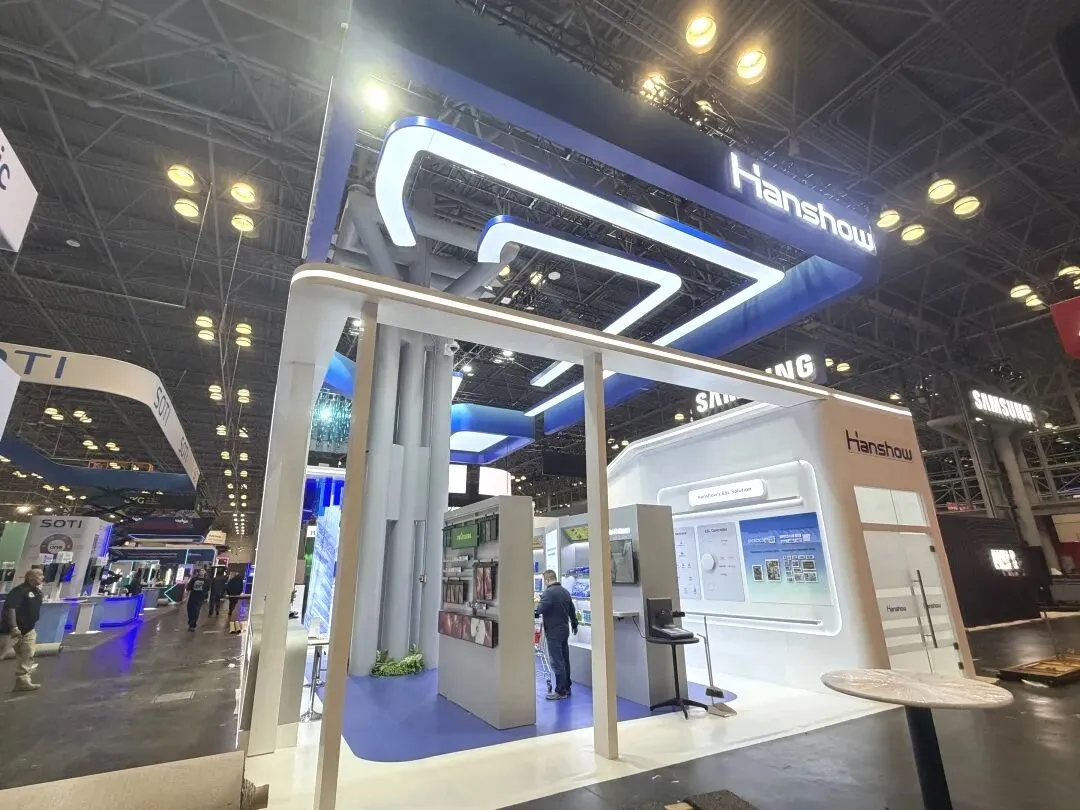 逸岚国际为 Histone 打造的展台,以品牌蓝白为主调,顶部悬浮的环形发光装置既是视觉焦点,也巧妙界定了展区范围;白色主结构搭配垂坠绿植,让科技感里多了几分柔和;发光接待台 + 嵌入式产品展示区,把「展示 + 洽谈」功能紧凑融合,既不拥挤也不空旷。