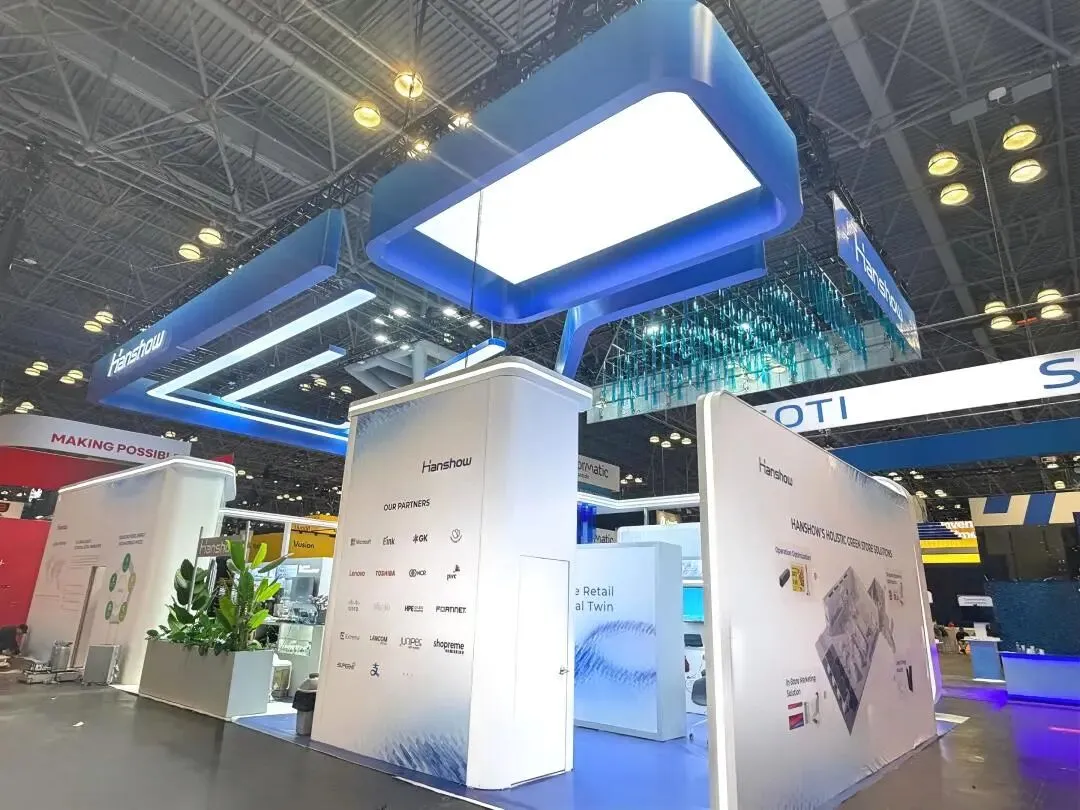 逸岚国际为汉朔搭建的展台以 “蓝白极简 + 科技质感” 为核心,把零售数字化方案具象成了可感知的空间:
