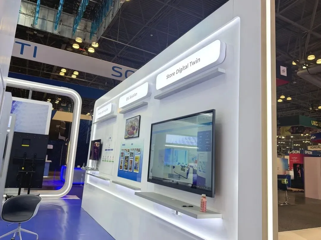 ·细节巧思:分区展示墙清晰呈现 “ESL 方案”“智能机器人” 等产品矩阵,发光展具与品牌色调呼应,强化科技属性。